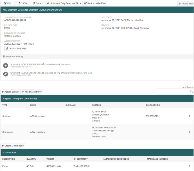 - History: Logs every event for the shipment, including creation time, edits, and CBP responses (Accepted, Rejected, Released).