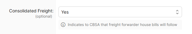 - Optional field, should only be completed to indicate to CBSA that freight forwarder house bills will follow this shipment. Consolidated freight is a number of separate shipments grouped together by a consolidator or freight forwarder and shipped under one cargo control document, in which case CBSA would expect deconsolidated details on house bills after the shipment has moved in bond.