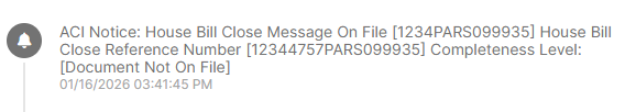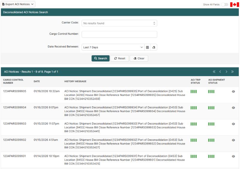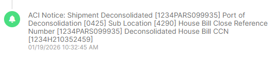 In BorderConnect, users can monitor deconsolidation progress by reviewing the following ACI Notice messages on the ACI shipment history section.